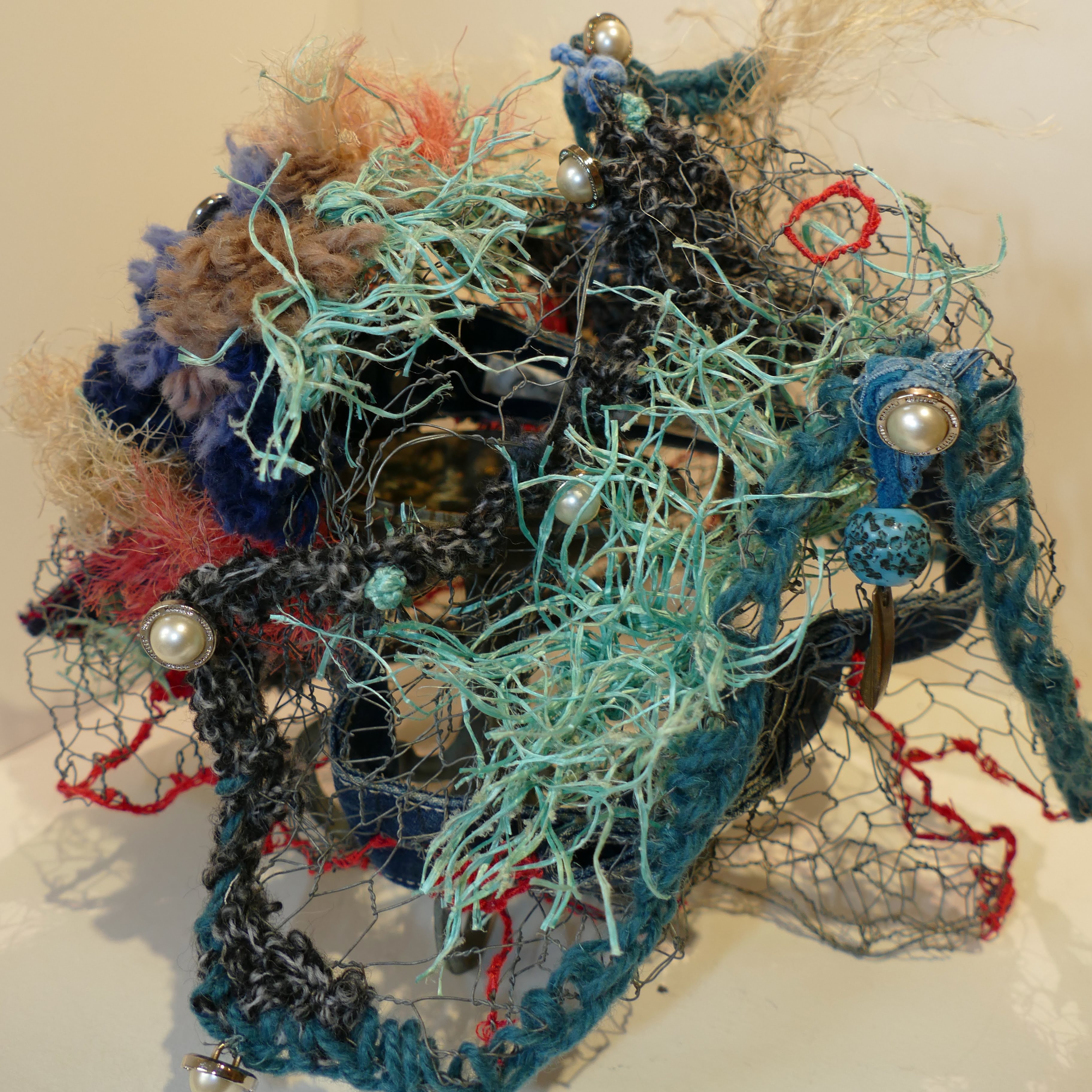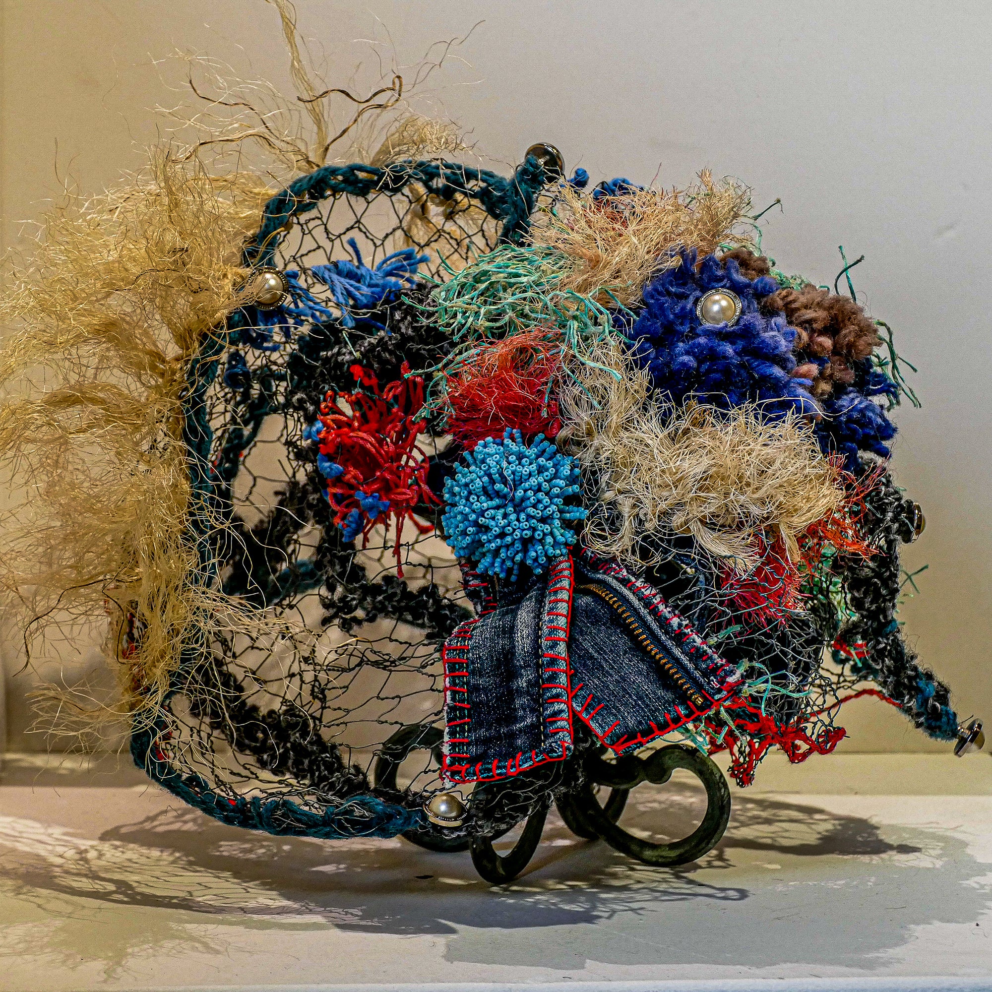 Weaving together river-worn chicken wire, waste carpet yarn, Girl Guide ropes, recycled denim, and fragments of pre-loved jewellery and Chanel buttons, MaggyJ crafts a three-dimensional exploration of entanglement - emotional, environmental, and social.